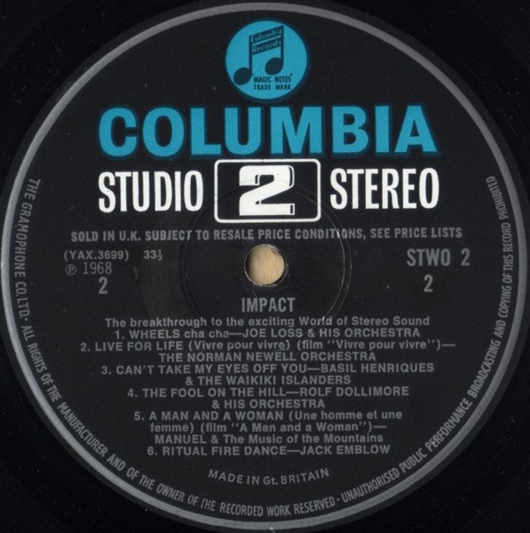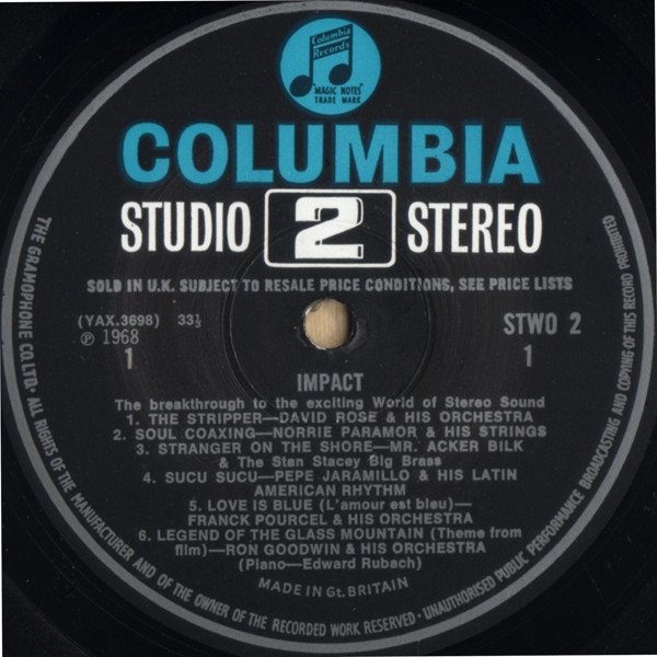 Front-laminated flipback cover.The breakthrough to the exciting world of stereo sound.File under Popular: Miscellaneous.℗ 1968 Front Cover Photo: Glass Fracture By Shot Gun Pellets. Photo by courtesy of the Royal Aircraft Establishment. Crown Copyright Reserved.E.M.I. Records (The Gramophone Company Ltd) Hayes • Middlesex • England Made and Printed in Great Britain6810 TPS Printed and made by Garrod & Lofthouse Ltd.Sold in U.K. subject to resale price conditions, see price lists (Imprint on Label)Made in Gt.BritainPublishing: A1: Bregman Vocco Conn Ltd. A2: Southern Music - BIEM A3: Sherwin Music Ltd. Lansdowne Series A4: Peter Maurice - Mecolico - BIEM A5: Shaftesbury Music - BIEM A6: Keith Prowse - World Music - Bosworth - BIEM B1: Petford Music Ltd. - Mecolico - BIEM - NCB B2: United Artists Music - Mecolico - BIEM - NCB B3: Ardmore & Beechwood - Mecolico - BIEM - NCB B4: Northern Songs - NCB B5: Leeds Music - Mecolico - BIEM B6: BIEMMisc info on tracklist: A1: A Capitol Recording A3: Lansdowne Series B1: Cha ChaTaken from album: A1: "Holiday For Strings" TWO 216 A2: "Soul Coaxing" TWO 207 A3: "Blue Acker" TWO 230 A4: "Mexicana Holiday" TWO 206 A5: "The Frank Pourcel Sound" TWO 202 A6: "Legend Of The Glass Mountain" TWO 220 B1: "Latin A La Loss" TWO 224 B2: "Falling In Love" TWO 217 B3: "Hawaiian Nights" TWO 218 B4: "Music For A Special Evening" TWO 215 B5: "Magic Fountains" TWO 219 B6: "Accordion Fire" TWO 228Label says "33⅓" , unlike [r=5711195].