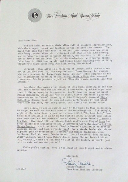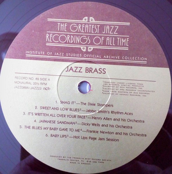 Made in Sweden. Booklet printed in U.S.A. with notes by Dan Morgenstern. FMRS letter signed Stanley Walker, Vice President and Director. Box spine reads:- Jazz Brass / Dickie Wells . J.J. Johnson . Charlie Shavers . Clark Terry Track listing from labels and booklet. Issue no.23, Records 89, 90, 91 and 92 of 25no. box, 100 no. record series.