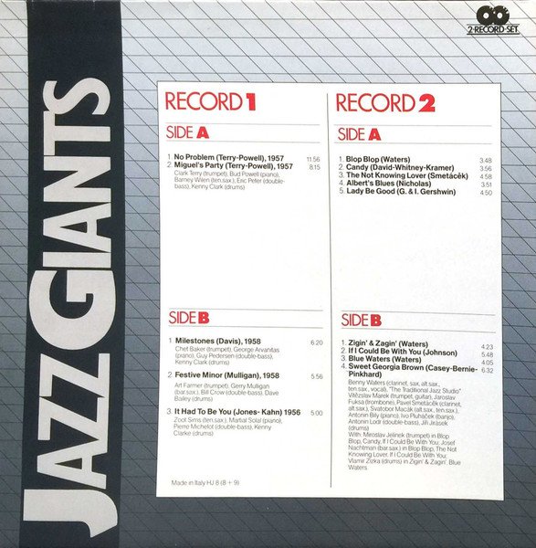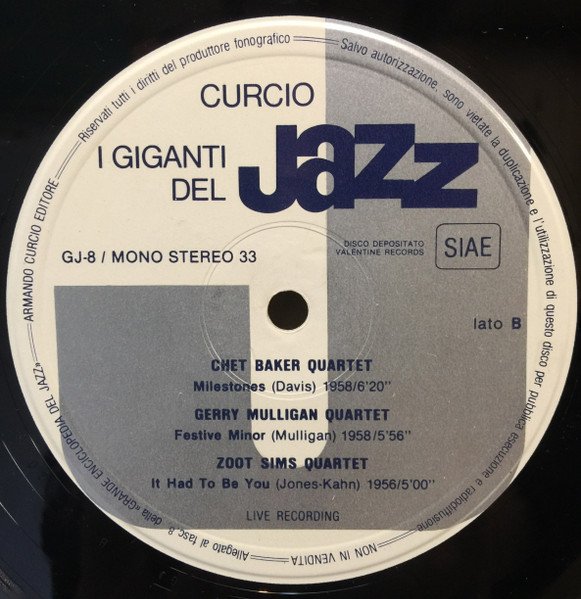 2-Record-Set HJ 8(8 +9) is a reissue of [r4036208] and [r2609854] Inside gatefold sleeve with English liner notes "A Short History Of Jazz" (1 LP Curcio releases: gatefold sleeves with Italian liner notes and pictures of the main artists.) Record 1 (GJ-8): live recordings Record 2 (GJ-9): a reissue of [r3228052] with English track titles and liner notes. Matrix / Runout #s stamped; <1>, <1 1 7> and <8> are pressing marks