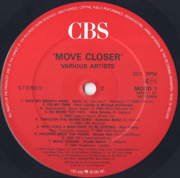 © 1987 CBS Studios ℗ 1986 Arista Records Inc. Track A1 ℗ 1986 Mute Records Ltd. Track A2 ℗ 1986 CBS Records Track A3 ℗ 1986 CBS Inc. Track A4 ℗ 1986 CBS Inc. Track A5 ℗ 1987 CBS Records Track A6 ℗ 1986 CBS Inc. Track A7 ℗ 1985 CBS Inc. Track A8 ℗ 1985 CBS Inc. Track B1 ℗ 1986 MCA Records Ltd. Track B2 ℗ 1986 Legend Music Group Ltd. Track B3 ℗ 1986 CBS Records Track B4 ℗ 1986 CBS Records Track B5 ℗ 1985 WEA International Inc. Track B6 ℗ 1984 Production Carrare Track B7 The LP title is shown as 'MOVE CLOSER' on labels and MOVE CLOSER on front cover. 'Made in England' (labels, back cover) 'Produced In Association With MCA, WEA, CARRERE' (back cover) There is a similar UK release '[r=7660209]' but there are label differences. On this version, the 'CBS AND Ⓡ CBS INC.' text on the labels is separate from the main label rim text at the 6 o'clock position. On the other version all rim text is combined. The first part of the runout string (Cat no to side indicator) is hand-etched, the rest is stamped