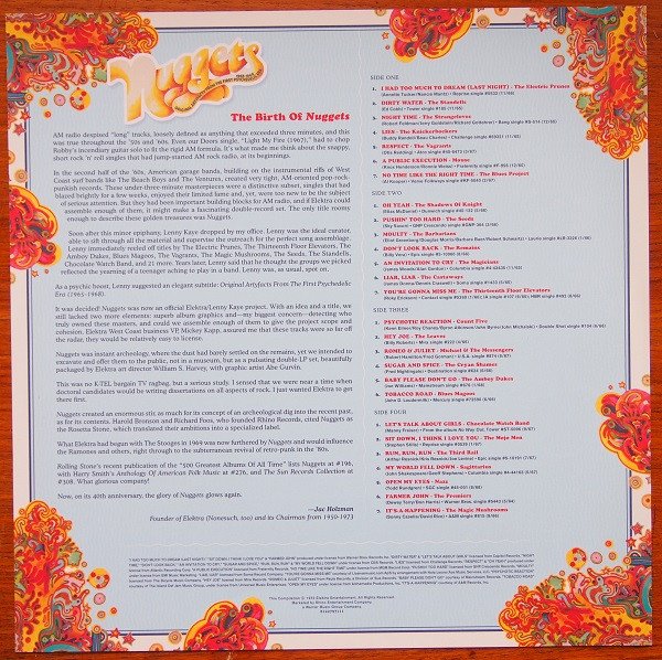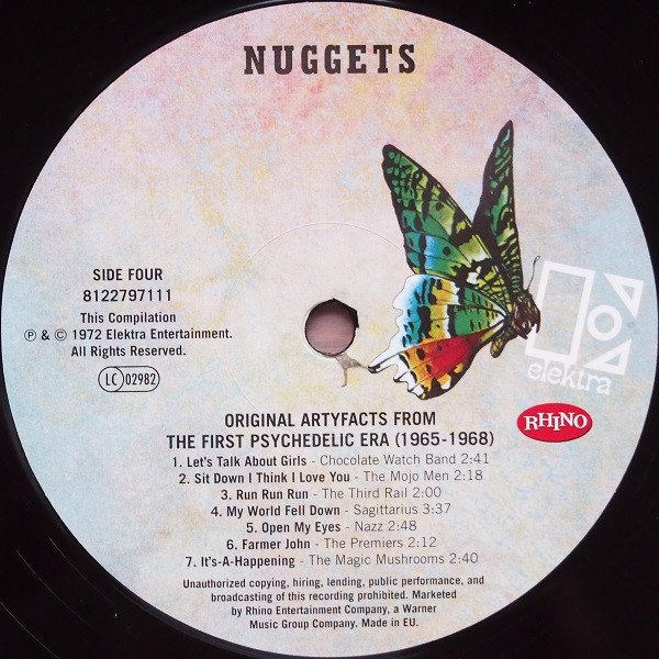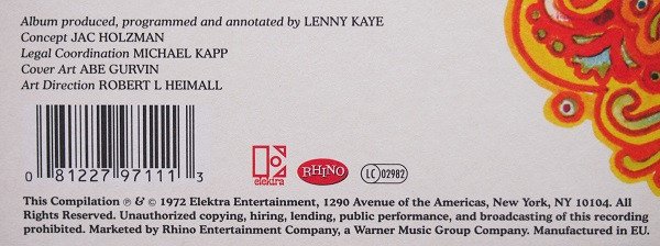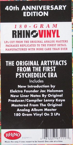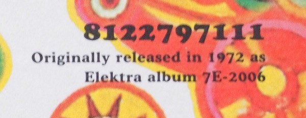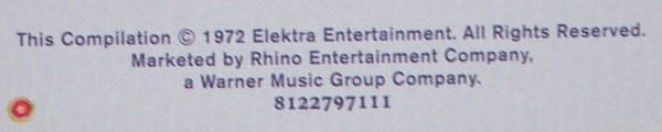 ℗&© 1972 Elektra Entertainment. Marketed by Rhino Entertainment Company, a Warner Music Group Company. Made in E.U. Like most Rhino reissues - Rhino pressed both an EU version and a US version [[r4039064]]. This is the EU pressing. Judging from the matrix nos, it looks as though plating (Mastered At role) was done at [url=http://www.discogs.com/label/Rainbo%20Records]Rainbo[/url] (S-83556 to 9) and EU version pressed by Optimal. Optimal plating markings at end of runouts are mirrored. Front shrink wrap has large [url=http://www.discogs.com/label/Rhino+Vinyl]RHINO VINYL[/url] sticker on it including Bar Code. Includes new 2012 liner notes by Lenny Kaye. Track durations on labels are largely inaccurate. Where the discrepancy between stopwatch-derived durations and those on labels is greater than ±5 seconds (A2, A3, A6, A7, B7, C1, 2, 3, 5 & 6, D3-7), stopwatch-derived durations are, in line with [g12.6.5], given here, and where the discrepancy is less than ±5 seconds, timings are as on labels.