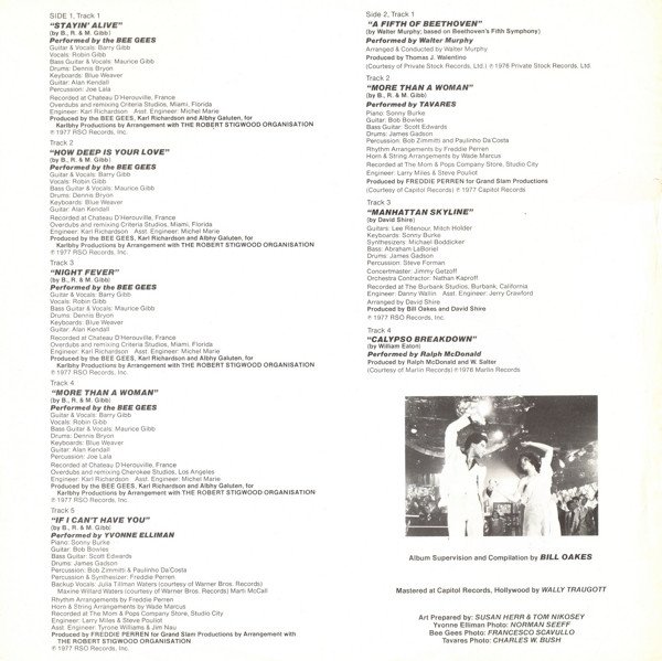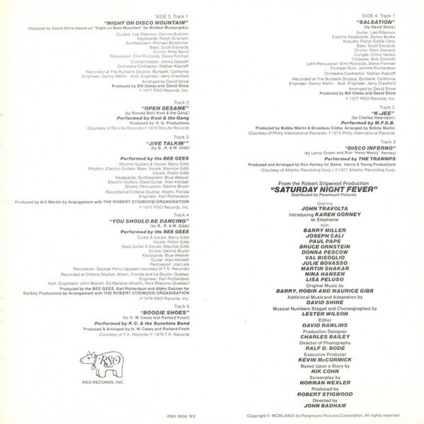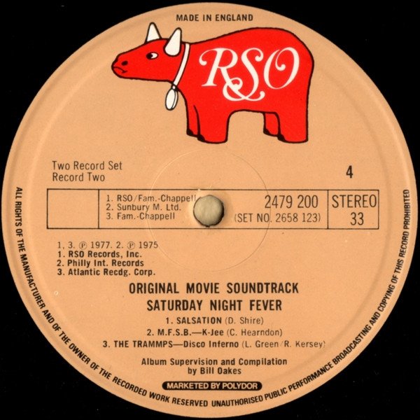 Recorded at Chateau D'Herouville, France (A1 to A4); The Mom & Pops Company Store, Studio City (A5, B2); The Burbank Studios, Burbank, California (B3, C1, D1); Criteria Studios, Miami, Florida (C3, C4); Le Studio, Quebec (C4). Mastered at Capitol Records, Hollywood. ℗1975 RSO Records, Inc. (C3). ℗1975 Philly International Records (D2). ℗1976 RSO Records, Inc. (C4). ℗1976 T.K. Records (C5). ℗1976 Private Stock Records, Ltd. (B1). ℗1976 Marlin Records (B4). ℗1976 De-Lite Records (C2). ℗1977 RSO Records, Inc. (A1 to A5, B3, C1, D1). ℗1977 Capitol Records (B2). ℗1977 Atlantic Records Corp. (D3). ℗1977 Robert Stigwood Organisation. Publishers: A1-A5, B2, C1, C4: RSO / Chappell B1: EMI Mus. Pub. Ltd. B3, D1: RSO / Fam. Chappell B4: Sunbury Mus. Ltd. C2: Planetory-Nom (L) Ltd. C3: Abigail M. Ltd. C4: Flam. M. Ltd. C5, D2: Sunbury M. Ltd. MCPS D3: Fam. -Chappell This edition has D2 published by Sunbury M. Ltd. Other versions have it published by Dunbar N. Inc./Prestige M. Ltd. Set. no: 2658 123 Disc 1: 2479 199 Disc 2: 2479 200 Issued in a gatefold sleeve. Some issues come with a 12" x 12" credit insert. Label variation compared to [r=8313694]. This version has "MADE IN ENGLAND" printed at the top of the labels.