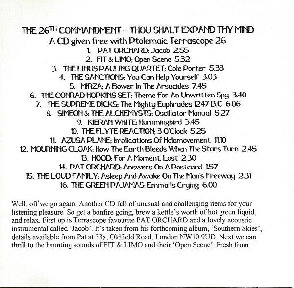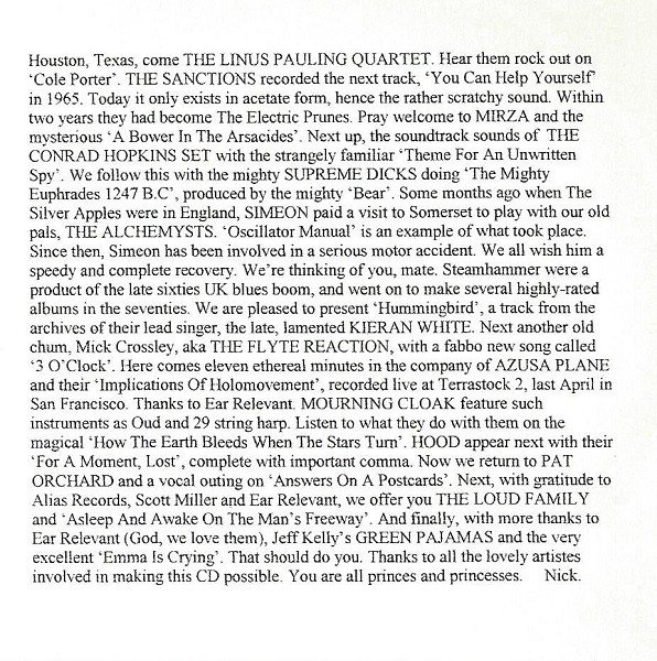 A CD given free with Ptolemaic Terrascope 26, Spring 1999. Notes on track sources from liner notes: Track 1 from the forthcoming album '[r=16248750]' Track 4 recorded 1965. Today it only exists in acetate form, hence the rather scratchy sound. Track 7 produced by the mighty 'Bear' Track 8 recorded in Somerset, England Track 9 from the archives of Kieran White Track 11 recorded live at Terrastock 2, last April in San Francisco. Thanks to Ear Relevant. Track 15 with gratitude to Alias Records, Scott Miller and Ear Relevant Track 16 thanks to Ear Relevant