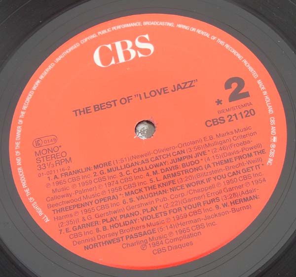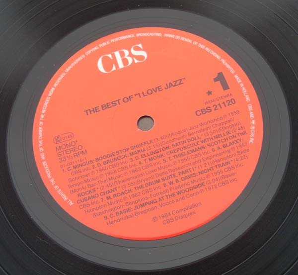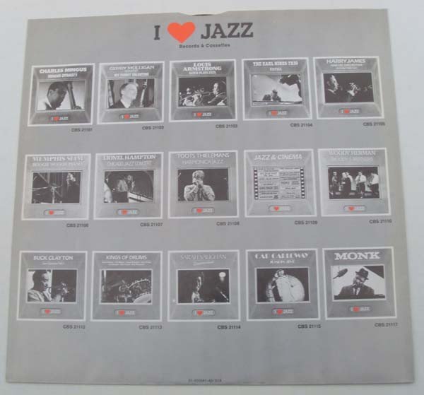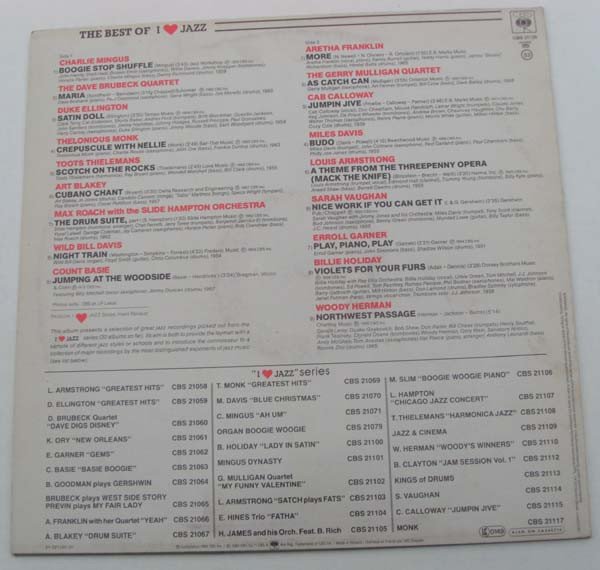 This album presents a selection of great jazz recordings picked out from the I ♥ Jazz series (30 albums so far). Its aim is both to provide the layman with a sample of different jazz styles or schools and to introduce the connoisseur to a collection of major recordings by the most distinguished exponents of jazz music. Compilation ℗ 1984 CBS Disques. © 1984 CBS Inc. Made in Holland. Distribution CBS Records / CBS Disques S.A. Publishers: A1 - Jazz Workshop ℗ 1959 CBS Inc. A2 - Chappell/Schirmer ℗ 1969 CBS Inc. A3 - Tempo Music ℗ 1958 CBS Inc. A4 - Bar-Thel Music ℗ 1963 CBS Inc. A5 - Love Music ℗ 1955 CBS Inc. A6 - Delta Research and Engineering ℗ 1957 CBS Inc. A7 - Slide Hampton Music ℗ 1962 CBS Inc. A8 - Frederic Music ℗ 1954 CBS Inc. A9 - Bregman, Vocco & Conn ℗ 1972 CBS Inc. B1 - E.B. Marks Music B2 - Criterion Music ℗ 1959 CBS Inc. B3 - E.B. Marks Music ℗ 1974 CBS Inc. B4 - Beechwood Music ℗ 1958 CBS Inc. B5 - Harms, Inc. ℗ 1955 CBS Inc. B6 - Gershwin Pub./Chappell ℗ 1950 CBS Inc. B7 - Garner ℗ 1954 CBS Inc. B8 - Dorsey Brothers Music ℗ 1959 CBS Inc. B9 - Charling Music ℗ 1965 CBS Inc.