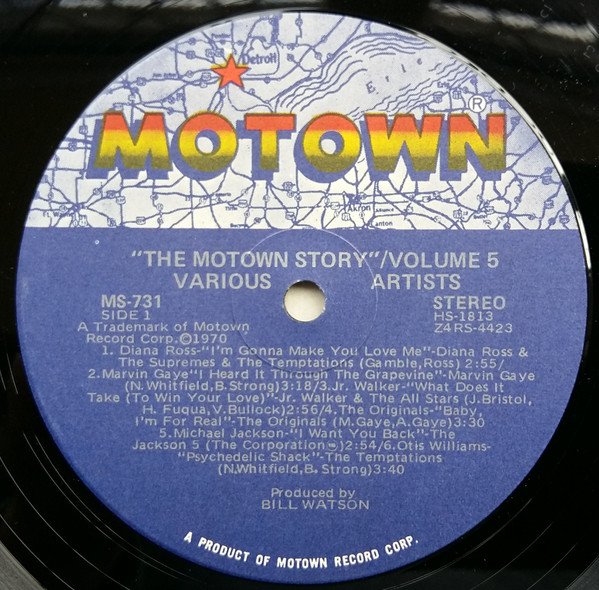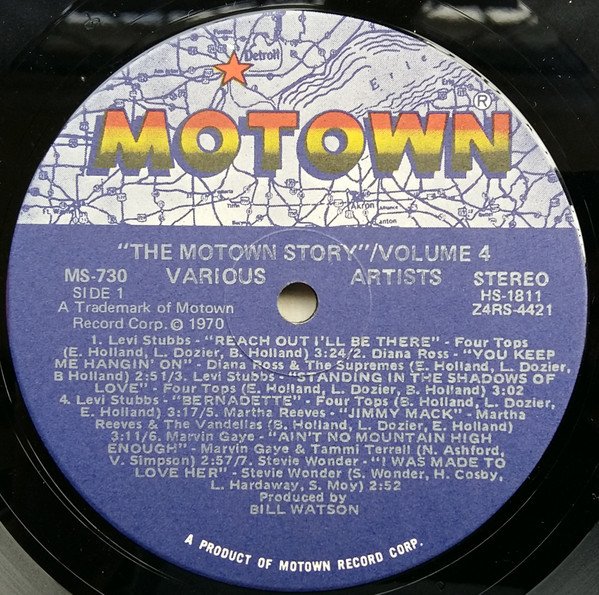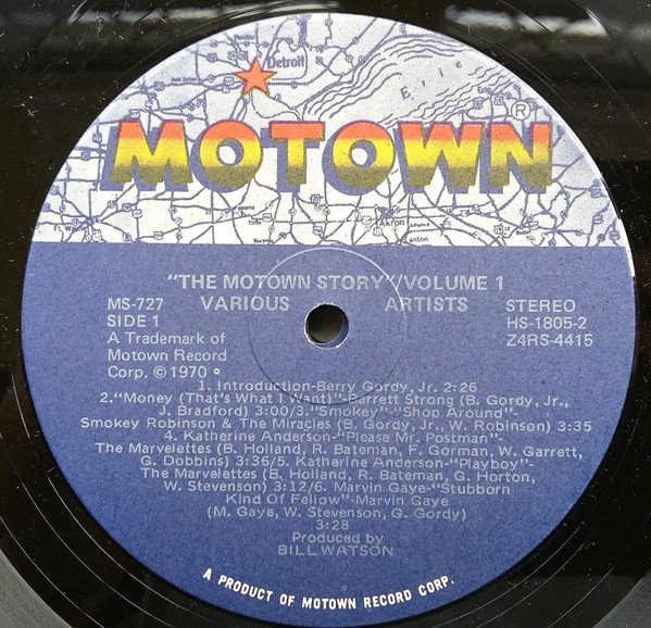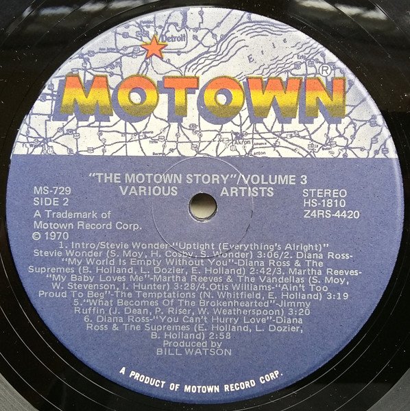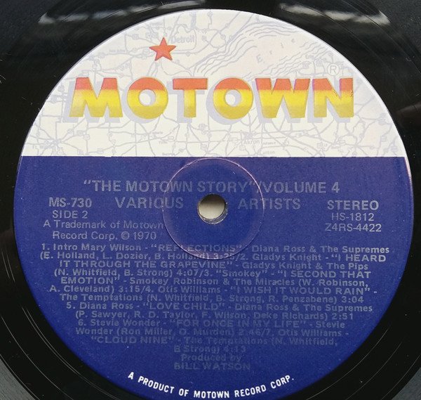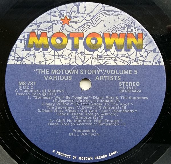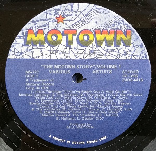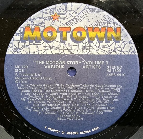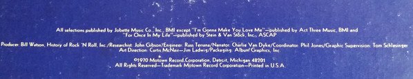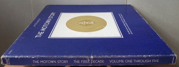 This is the second pressing box set which did not include the 24 page booklet, inner picture sleeves or textured graphics on the outer box. Subtitle: "The First Decade" Note: Notice How The Label Layout & Font Changes Throughout The Discs, Disc 1 Has Side 1 & Side 2 Text Below The "MS-727" Code, Whereas Record 2 Has The Side 1 & 2 Text Above The "MS-728" Code & A Different Font, Disc 3 Has A Similar Layout To Disc One, Disc 4 & 5 Have A Similar Layout To Discs 1 & 2 But The Font Is Also Different On The Both © 1970 All selections published by Jobette Music Co., Inc., BMI except "I'm Gonna Make You Love Me" – published by Act Three Music, BMI and "For Once In My Life" – published by Stein & Van Stock, Inc., ASCAP Producer: Bill Watson, History of Rock 'N' Roll, Inc. Researcher: John Gibson Engineer: Russ Terrana Narrator: Charlie Van Dyke Co-ordinator: Phil Jones Graphic Supervision: Tom Schlesinger Art Direction: Curtis McNarr & Jim Ladwig Packaging: Album Graphics Inc. All Rights Reserved – Trademark Motown Record Corporation – Printed in U.S.A © Motown Record Corporation, Detroit, Michigan 48201