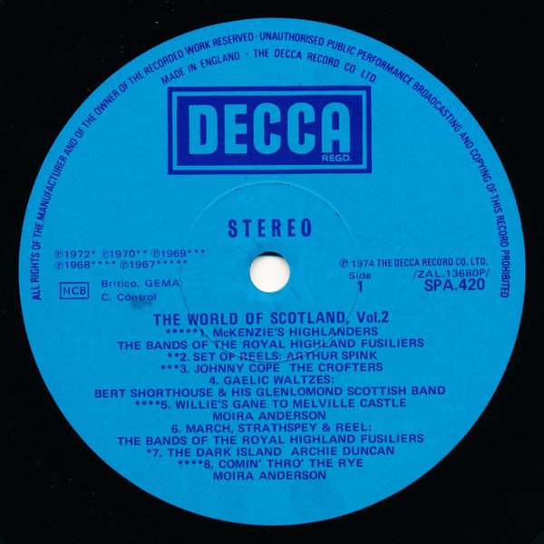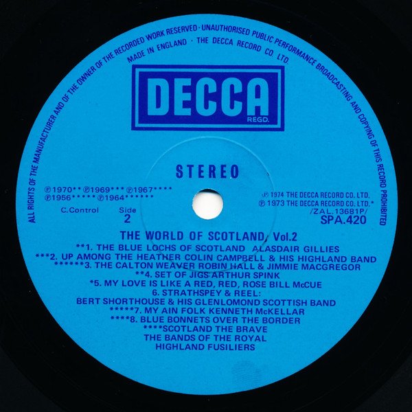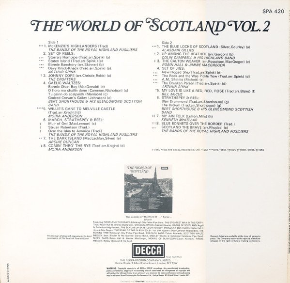 ℗ The Decca Record Co. Ltd. 1974 (tracks A4, A6 and B6) 1973 (track B5) 1972 (track A7) 1970 (tracks A2, B1 and B4) 1969 (tracks A3 and B2) 1968 (tracks A5 and A8) 1967 (tracks A1 and B8) 1964 (track B3) 1956 (track B7) Front cover photograph reproduced by kind permission of The Scottish Tourist Board. Laminated with 'Clarifoil' made by British Celanese Limited. Sleeve printed in England by Clout & Baker Ltd..