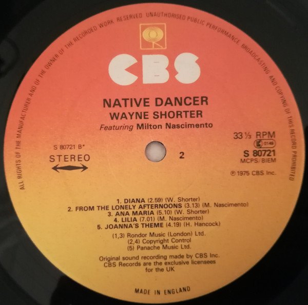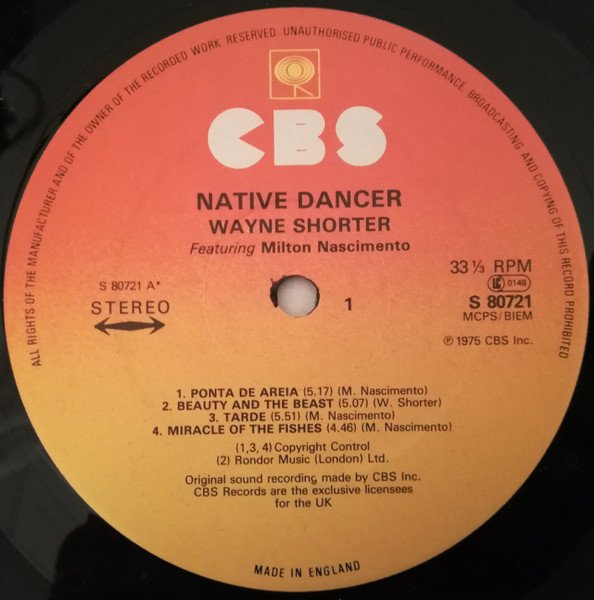 Recorded at Village Recorders, Los Angeles. Complete Author/Title : Wayne Shorter featuring Milton Nascimento "Native Dancer" ℗ & © 1975 CBS Inc. Made in England Very similar to [r785395] but with modified label layout / font type