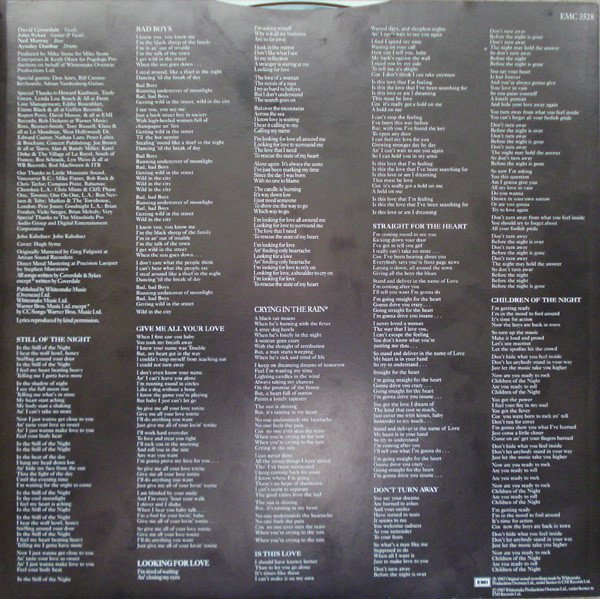 ℗ & © 1987 Original sound recordings made by Whitesnake Overseas Ltd, under license to EMI Records Ltd. Produced for Mike Stone Enterprises & Pogologo Productions on behalf of Whitesnake Overseas Productions Ltd. On the spine, states the album being called 1987 Originally mastered at Artisan Sound Recorders. Direct metal mastering at Precision Lacquer May have original white sticker on front cover with the following black text: Includes The Hit Singles "IS THIS LOVE" & "STILL OF THE NIGHT" EMC 3528 An initial number were released with a Limited Edition Embossed Sleeve: [r4826857].