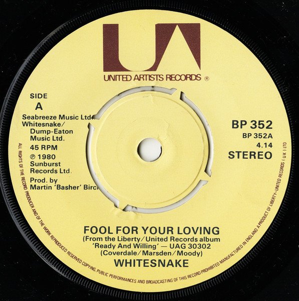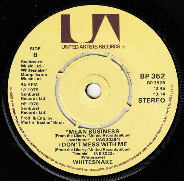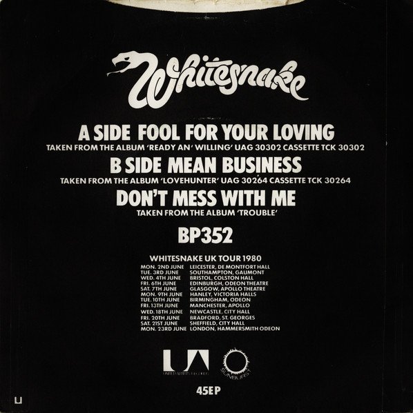 Non fluorescent EMI pressing. Fluorescent EMI pressing is here [r4453198]. Non fluorescent Lyntone pressing is here [r4541159]. Fluorescent Lyntone pressing is here [r10650790] Label Notes: Manufactured in England A product of Liberty-United Records (UK) Ltd Seabreeze Music Ltd. / Whitesnake / Dump-Eaton Music Ltd. [A-Side] ℗ 1980 Sunburst Records Ltd. [B1] ℗ 1979 Sunburst Records Ltd. [B2] ℗ 1978 Sunburst Records Ltd. Sleeve Notes: 45EP BP352 James Upton [next to a 'U' shaped logo] [A-Side] Taken from the album '[url=http://www.discogs.com/master/11245]Ready An' Willing[/url]' UAG 30302 Cassette TCK 30302. [B1] Taken from the album '[url=http://www.discogs.com/master/11108]Lovehunter[/url]' UAG 30264 Cassette TCK 30264. [B2] Taken from the album '[url=http://www.discogs.com/master/11318]Trouble[/url]'. Whitesnake UK Tour 1980 Mon. 2nd June Leicester, De Montfort Hall Tue. 3rd June Southampton, Gaumont Wed. 4th June Bristol, Colston Hall Fri. 6th June Edinburgh, Odeon Theatre Sat. 7th June Glasgow, Apollo Theatre Mon. 9th June Hanley, Victoria Halls Tue. 10th June Birmingham, Odeon Fri. 13th June Manchester, Apollo Wed. 18th June Newcastle, City Hall Fri. 20th June Bradford, St. Georges Sat. 21st June Sheffield, City Hall Mon. 23rd June London, Hammersmith Odeon Month of release information from Record Collector Magazine April 1984 p.13 Runout notes: The runouts are stamped except BILBO TA1PE which is etched and some numbers after U1 and BILBO - TA1PE are mirror inverted Runout var.2 B side TA1PE is Stamped -- Release Notes: On the A-side run-outs the '1' part of '21' is mirrored. On the run-outs of both sides the solitarily stamped '1's have been scratched out, and replaced with a '2' On all side A runouts, BILBO - TA1PE and BILBO TA1PE is etched On side B runouts, variants 1, 3, 4 and 5, TA1PE is etched On side B runout, variant 2, TA1PE is stamped --