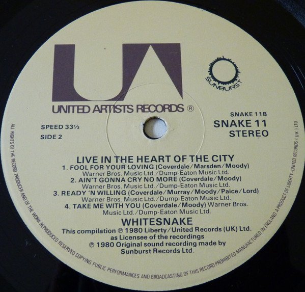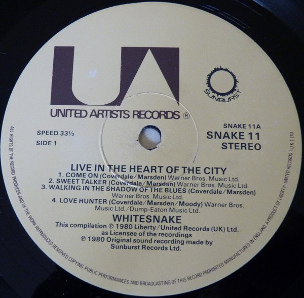 All songs recorded at The Hammersmith Odeon, London. Disc #1 cat no SNAKE 11, Disc #2 cat no SNAKE 12 Cover has a yellow stripe printed at the top left corner saying: "SPECIALLY PRICED DOUBLE ALBUM SET" Single sleeve with printed insert. Recorded and produced by Martin Birch for Sunburst Records Sides C and D are the previously-issued, Japan only, "Live At Hammersmith", which was not initially meant for UK issue.