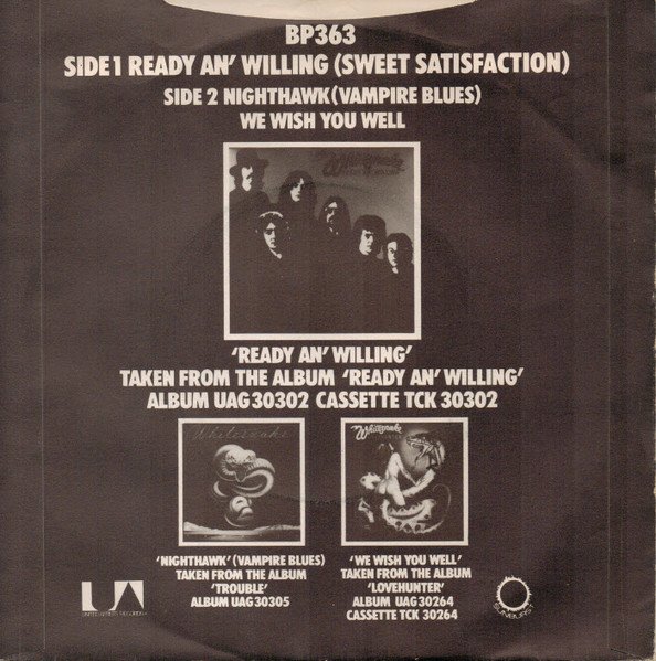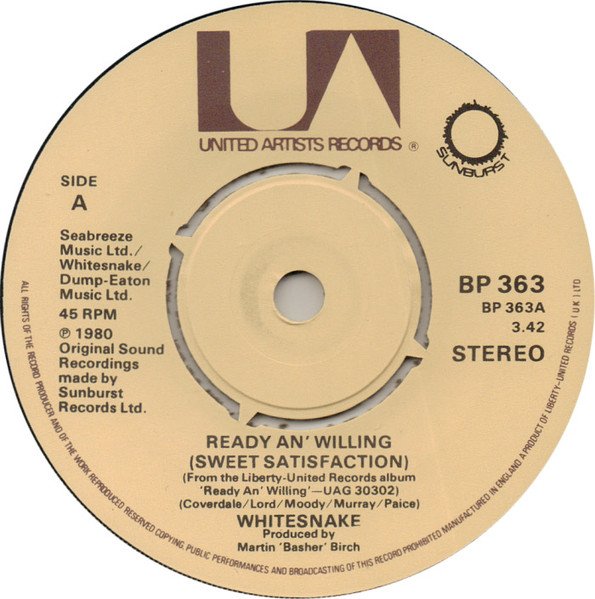 The standard U.A. black, and brown on cream, paper label, with the Sunburst logo added. Label Notes: Manufactured In England A Product Of Liberty-United Records (UK) Ltd [A-Side] Seabreeze Music Ltd. / Whitesnake / Dump-Eaton Music Ltd. ℗ 1980 Original Sound Recordings made by Sunburst Records Ltd. [B-Side] Seabreeze Music Ltd. / Whitesnake [B1] ℗ 1978 Original Sound Recordings made by Sunburst Records Ltd. [B2] ℗ 1979 Original Sound Recordings made by Sunburst Records Ltd. Sleeve Notes: 45EP [A-Side] 'Ready An' Willing' Taken From The Album '[url=http://www.discogs.com/release/1524295]READY AN' WILLING[/url]' Album UAG 30302 Cassette TCK 30302 [B1] 'Nighthawk (Vampire Blues)' Taken From The Album '[url=http://www.discogs.com/release/1838390]TROUBLE[/url]' Album UAG 30305 [B2] 'We Wish You Well' taken from the album '[url=http://www.discogs.com/release/1484470]LOVEHUNTER[/url]' UAG 30264 Cassette TCK 30264'. Release Notes: Variant 1: The stamped '1's in the '1', and '17' parts of the run-outs, are mirrored. Month of release information from Record Collector Magazine April 1984 p.13