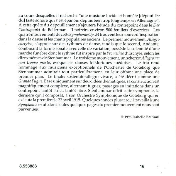 ℗ 1996 HNH International Ltd. © 1996 HNH International Ltd. Recorded at the Henry Wood Hall, Glasgow, on 15th and 16th August, 1996. Playing time: 57:41 Packaged in standard jewel case, including a 16-page booklet with liner notes (by P-G. Bergfors, originally written in Swedish) translated to English and German, plus different French liner notes.