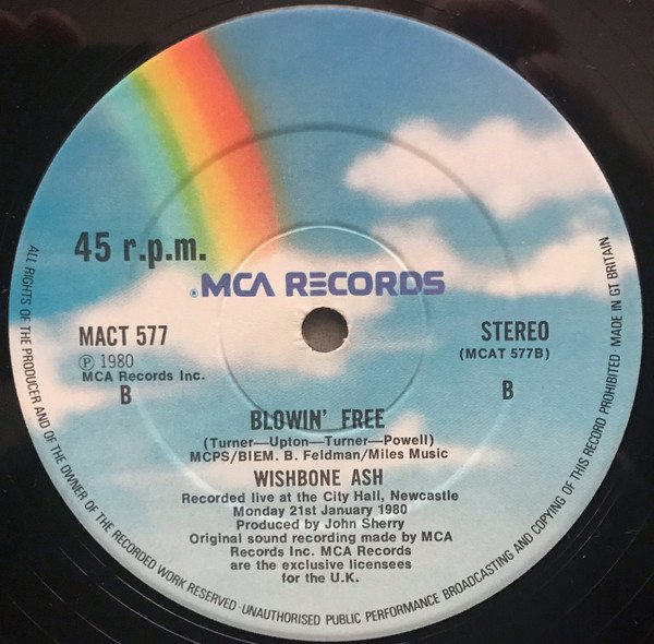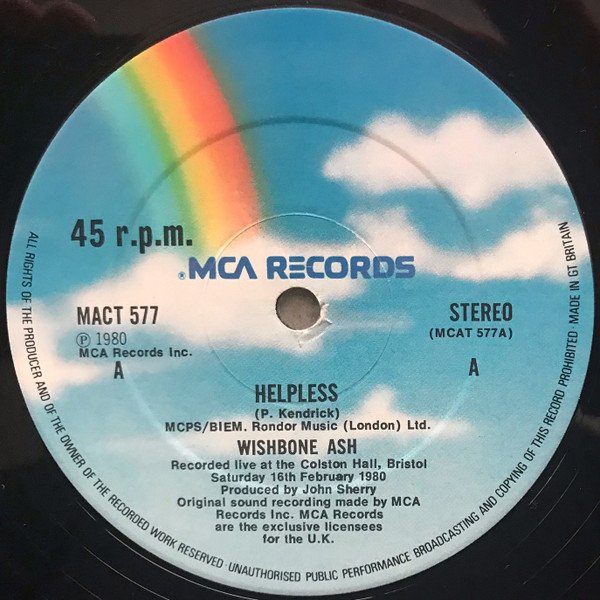 Matte cover with misprinted catalogue numbers on labels. The non-misprinted label pressing of this UK 12" is seen here [r17233342] On front cover: HELPLESS/BLOWIN' FREE BLOWIN' FREE/HELPLESS RECORDED LIVE ON THEIR RECENT UK TOUR WISHBONE LIVE! On side A label: "Recorded live at Colston Hall, Bristol Saturday 16th February 1980" On side B label: "Recorded live at City Hall, Newcastle Monday 21st January 1980" Catalogue # on spine and back cover: MCAT 577 Catalogue number is misprinted on labels as MACT 577 On back cover: The 18th of January 1980 marked to start of another World Tour for Wishbone Ash in this, their 11th Year on the road. These tracks were recorded live at the City Hall, Newcastle and the Colston Hall, Bristol