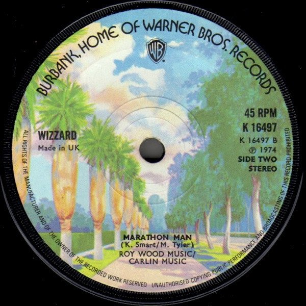 1st press issue (with smaller radius mold ridges around spindle-hole than the 'A2' repress; See Solid center repress (The artist credit text is also spaced downward on the repress) ℗1974 Roy Wood Music / Carlin Music Made in UK
