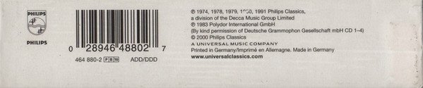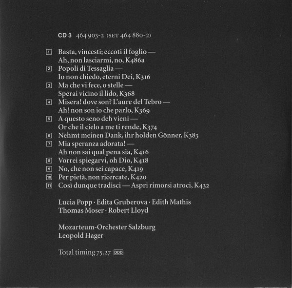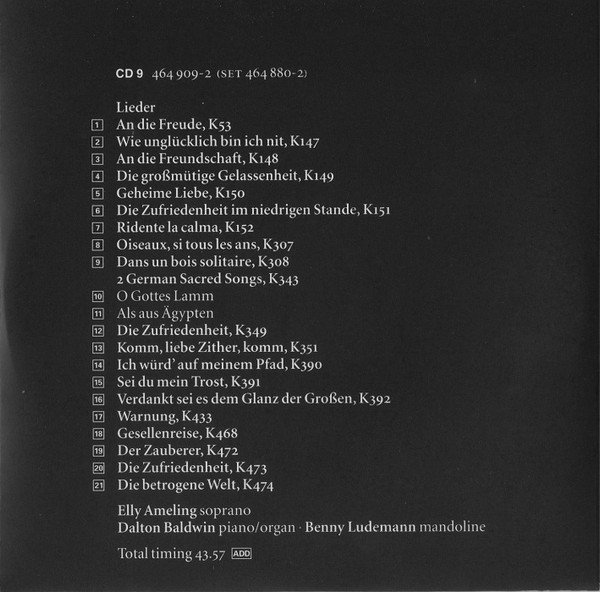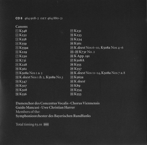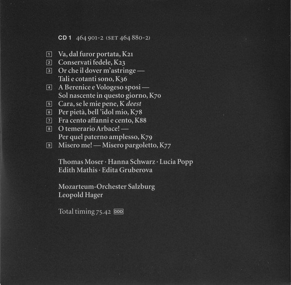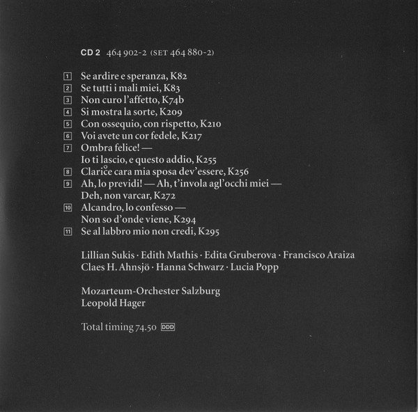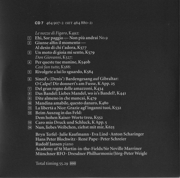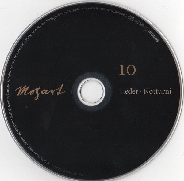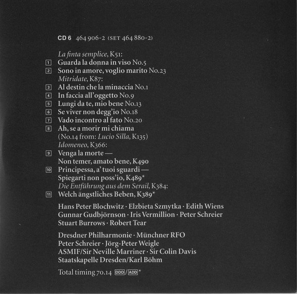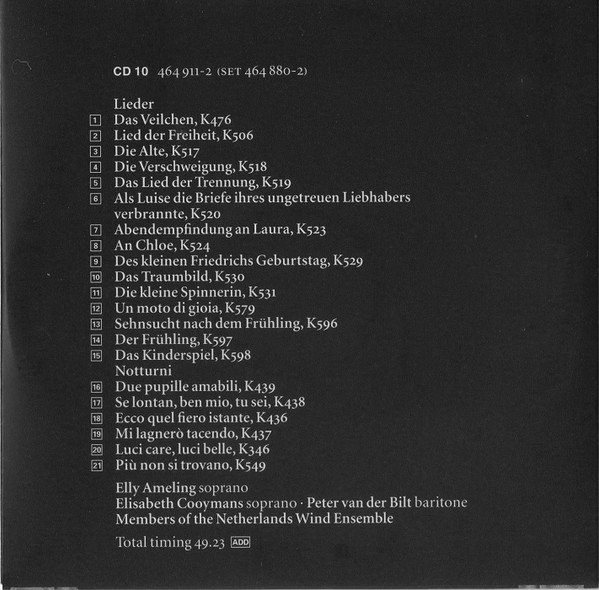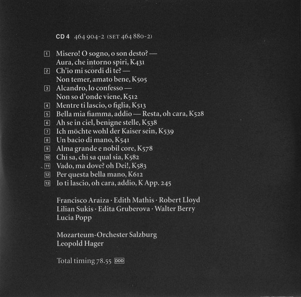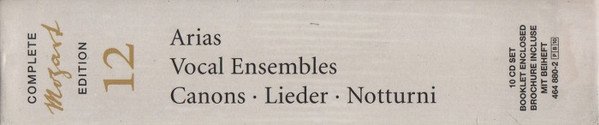 Recording locations: • Arias · Ensembles Vienna, 1979-82 (CDs 1-4); Lukaskirche, Dresden, September 1977, K489; March 1990, K51 No.5, 119, 295, 440, 480, 540b, 579, 625; Walthamstow, London, November 1978, K389, 433, 435, 580; July 1990, K51 No.23, 87 Nos 1, 9, 18 & 20, 492; Munich, January 1990, K83, 178, 434, 441, 479, 532, 552, 577, 584, Anh. 5; June 1990, K135, 293e, 294; January - September 1989, K490; • Canons Baumgartner Casino, Vienna, October 1986, K231, 232, 233, 234, 556, 558, 559, 559a, 561; Hofburgkapelle, Vienna, July 1990, K73r, 89, 228, 229, 230, 347, 348, 507, 508, 553, 554, 555, 557, 562; Herkulessaal, Munich, January 1991, K73i, 508a, Anh. 191, 508A, 562a, Interval Canons • Lieder Musis Sacrum, Arnhem, The Netherlands, August 1977 • Notturni Concertgebouw, Amsterdam, December 1973 ℗ 1974, 1978, 1979, 1990, 1991 Philips Classics, a division of the Decca Music Group Limited ℗ 1983 Polydor International GmbH (By kind permission of Deutsche Grammophon Gesellschaft mbH CD 1-4) © 2000 Philips Classics A Universal Music Company Printed in Germany/Imprimé en Allemagne. Made in Germany Clamshell box containing: - 10 CD's, each in their individual paper sleeve with simplified tracklisting and credits - 76-page booklet with complete detailed tracklisting, full credits and notes in English, French and German