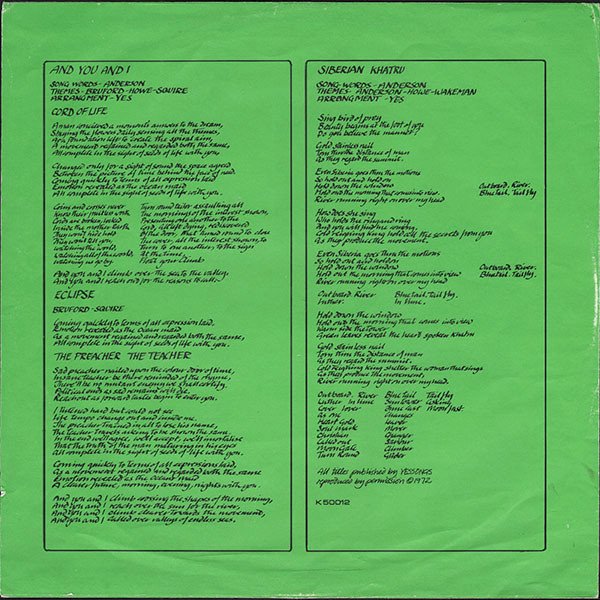Original UK release with earliest runouts (from A1/B1) in fully [outside & inside] textured [faux leather look] gatefold cover. Printed green side opening thick paper lyrics inner sleeve with flipbacks. No 'Made in UK' on labels. No 'v' below cat.# on labels. Silver trim around artist's name and title on cover. First cat.# on cover back, 2nd on cover spine, inner sleeve & labels. Labels: An Atlantic USA Recording Rondor/Yessongs ℗ 1972 Cover: [a149420] appears by courtesy of A&M records Ltd. an Atlantic record distributed by WEA Records Ltd. ℗ 1972 Inner sleeve: All titles published by YESSONGS reproduced by permission © 1972 Visually identical version here [r29986165] in that it is the only other UK copy that still has no reference to 'Made in UK' and no 'v' below cat.# on labels. The difference being a white rather than green inner sleeve that may indicate a repress. Runouts are stamped.