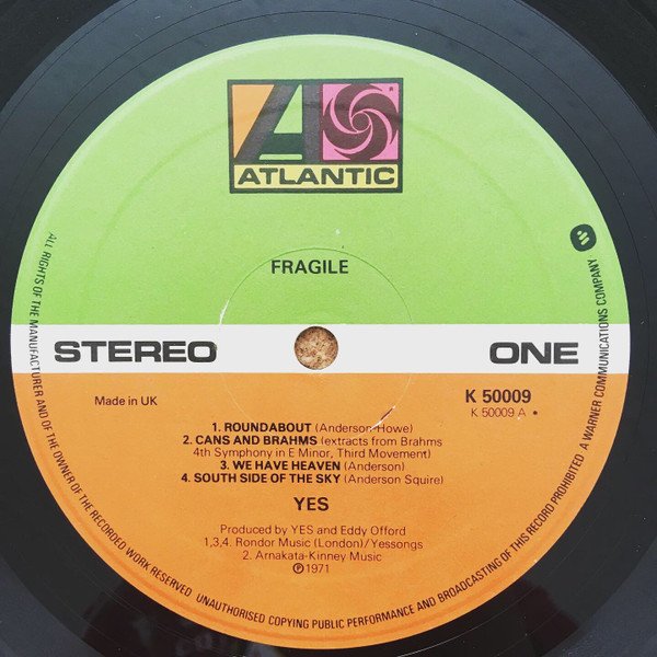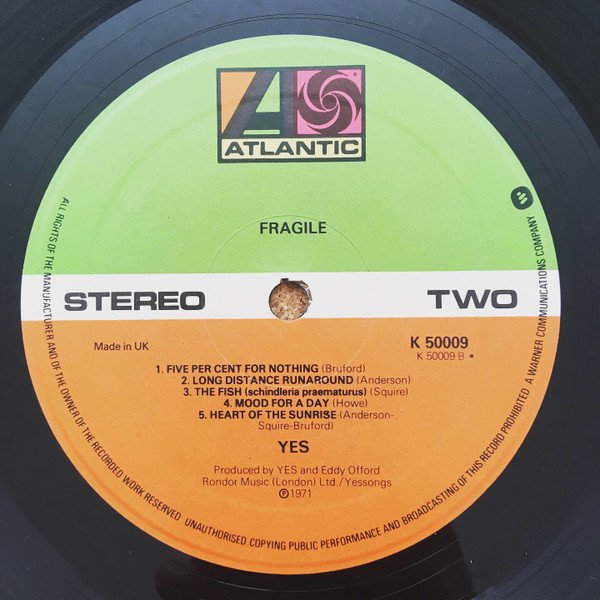 Release date: 1971-72First cat. no. on spine, 2nd on label. Green/Orange Atlantic label.Gatefold sleeve with lyrics.℗ 1971“Made in U.K.” under STEREO left hand side of label lower orange half.K 50009 k 50009 A*/B* underneath ONE/TWO right hand side of label lower orange half.“FRAGILE” central underneath ATLANTIC symbol on green half of label.Contains picture postcard as seen in ‘images’ [EDIT 1: This is mostly likely a mismatch between this album and a piece of ephemera I believe belongs to the album Yesterdays, supported by the fact that the artwork on this postcard is taken from the rear of the outer sleeve of Yesterdays.][EDIT 2: It is likely that this release came with the 8-page booklet typical of this album, but that the contributor of this release owns a copy whose booklet has gone missing, presumably unbeknownst to them.][EDIT 3: My copy, which I firmly believe is a variant of this release, bears the "E.G" signature of Eddy Gorecki, galvaniser extraordinaire. denoting a quality pressing process.]