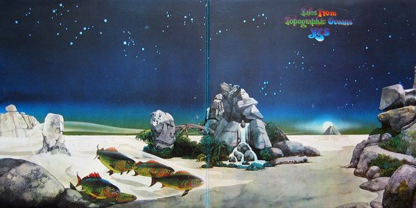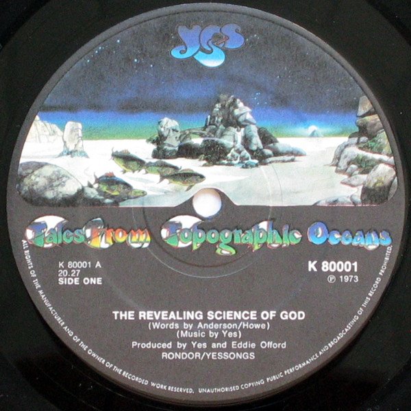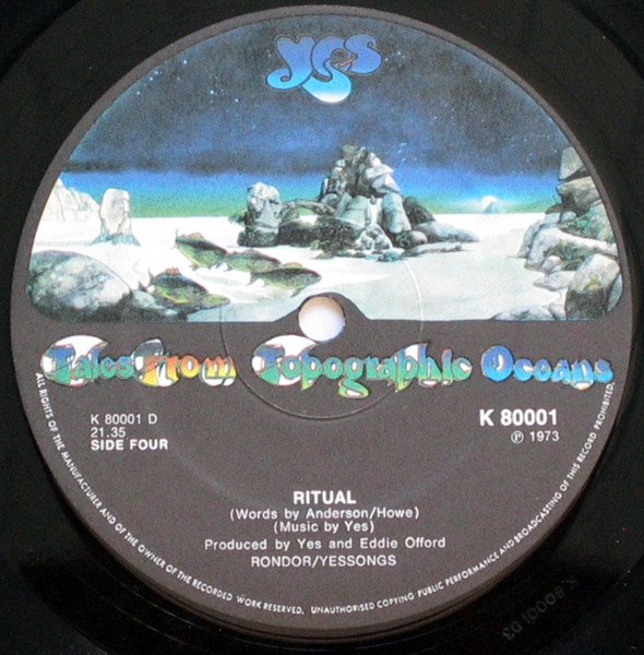 Original UK release in matt gatefold cover on custom made picture labels without Atlantic logo. Plain paper inner sleeves with text: PATENT NO· 1,125,555, MADE IN ENGLAND First catalogue number inside gatefold, 2nd on labels. Full colour sleeve with double page illustration, by [a1826912] across the front and rear faces of the outer sleeve. Song titles and lyrics printed across the double page inner faces on a black background. The respective second part of the song title is missing on the labels. Recorded at Morgan Studio London during late summer and early autumn 1973 ℗ 1973 Plates made by - Mansell Litho Printed and made in England by Shorewood Packaging An Atlantic Record distributed by WEA Records Ltd. © and ℗ 1973. Published by Yessongs Ltd [cover], Rondor/Yessongs [labels]. Similar release with Atlantic logo on labels: [r=6010444].