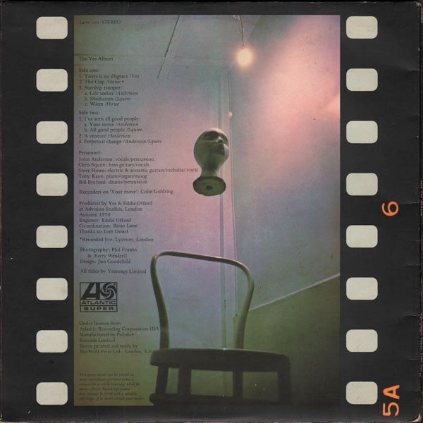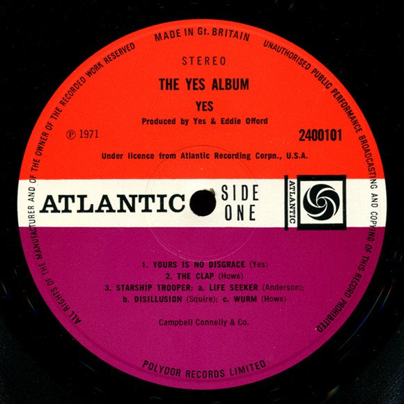 Released in a matte gatefold sleeve. Record label is shown as ''Atlantic Super'' on sleeve (spine and back cover) and just "Atlantic" on disc labels. [On back cover :] Produced at Advision Studios, London, Autumn 1970. Thanks to Tom Dowd. Track A2 recorded live, Lyceum, London. All titles by Yessongs Limited. Under licence from Atlantic Recording Corporation USA. Sleeve printed and made by MacNeill Press Ltd., London, SE1. [on Labels :] Made in Gt. Britain Ⓟ 1971 Under licence from Atlantic Recording Corpn., U.S.A. Campbell Connelly & Co. Polydor Records Limited This version looks identical to [url=https://www.discogs.com/release/12242060-Yes-The-Yes-Album]this other version[/url], but with a slightly narrower white stripe on labels (see the Atlantic swirl logo that extends beyond the white stripe).