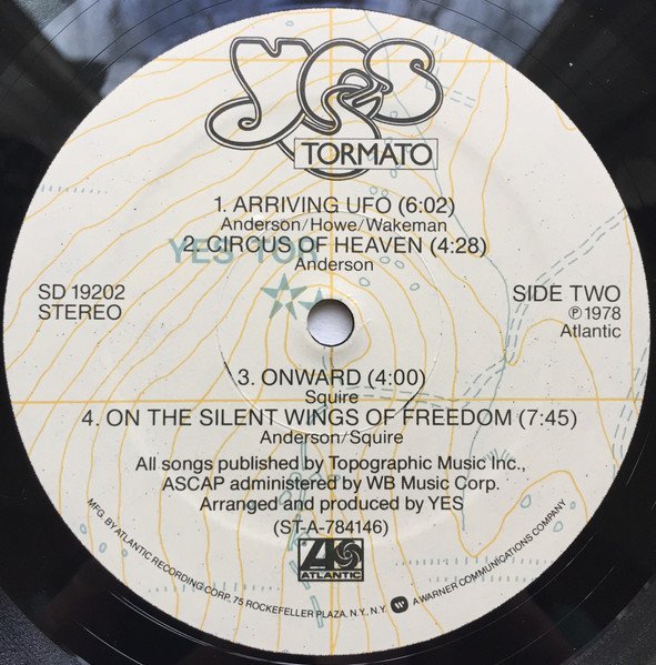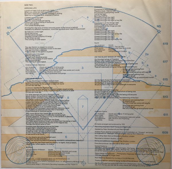 [l408779] pressing identified by "PRC" or "PRC (PR)" etched in runout. Do not confuse this submission with the [l130920] pressing, which has "(PR)P" or only "(PR)" in the runouts, found here: [r11381062]. Issued with a printed inner sleeve with lyrics, credits and recording info. Some copies designated as promo with gold foil stamp and timing strip sticker. "Future Times", "Madrigal" & "Arriving UFO" © 1978 Topographic Music Ltd. and Rondor Music Ltd. All other songs © 1978 Topographic Music Ltd. Runouts are etched. [Rear jacket:] Atlantic Recording Corporation 75 Rockefeller Plaza, New York, New York 10019 [Warner 'W' logo]® A Warner Communications Company ℗ 1978 Atlantic Recording Corporation and Star/Rights Co. Printed in U.S.A. [Inner sleeve:] All rights for the world on behalf of Topographic Music Ltd. administered by WB Music Corp. Sleeve & jacket design © 1978 Atlantic Recording Corporation and Star/Rights Co. Disc cutting Sean Davis at Strawberry Studios, London Recorded at Advision Studios, London Mixing and additional recording at Rak Studios, London Rick Wakeman appears by courtesy of [url=https://www.discogs.com/label/904-AM-Records?page=1]A & M Records[/url]. [Labels:] ℗ 1978 Atlantic All songs published by Topographic Music Inc., ASCAP administered by WB Music Corp. Mfg. by Atlantic Recording Corp., 75 Rockefeller Plaza, N.Y., N.Y. [Warner 'W' logo] A Warner Communications Company