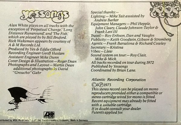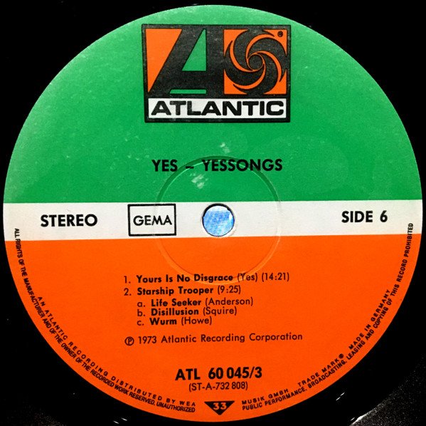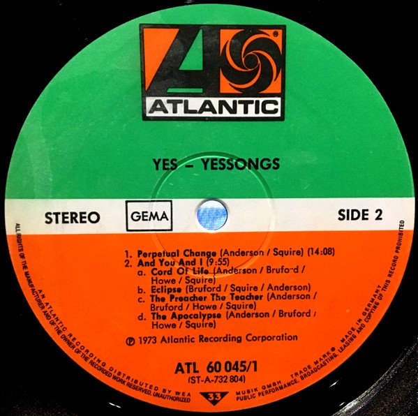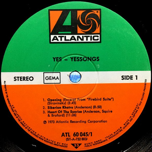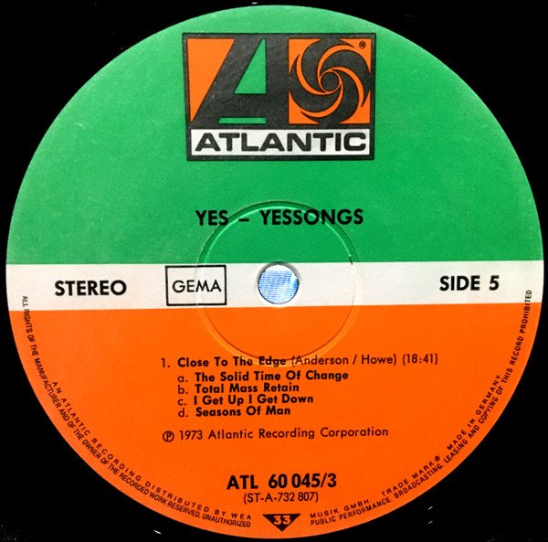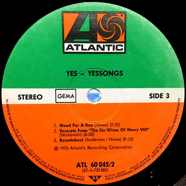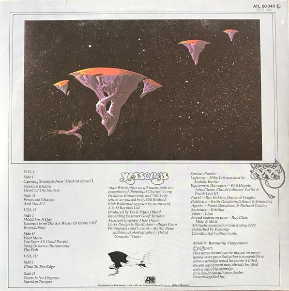 Similar to [r=10286406] but with price code Ⓔ in the upper right corner of the back sleeve.Second German edition: 3-panel gatefold without booklet and with Atlantic advertising inner sleeves.On rear cover: Original Atlantic release catalog no. in brackets below cat# Atlantic Recording Corporation ©&℗ 1973 - Made in Germany All tracks recorded on tour during 1972. Rick Wakeman appears by courtesy of A & M Records Ltd.NO label codes Catalog no. [ATL 60 045] and [(SD 3-100)] on rear cover and spine. Label identifiers as denoted in BaOI.Well known credits for instruments and vocals are not given on this release and are denoted as '[Uncredited]'Title of track A1 on rear cover is misspelled as 'Opening (Excerpts from "Firebird Sweet") instead of '(...Suite")' Title of track D2 on D side label is misspelled as 'Long Distance Runaround / The Fish (Schindleria Praimaturus)' instead of '...Praematurus)'Runouts are etched, except for "Manufactured in Germany", which is stamped.